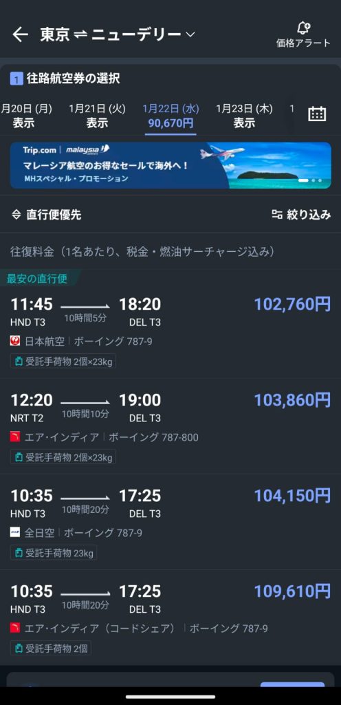 航空券やホテル予約をサポートしてくれるアプリやサイトはたくさんあるが、私がよく利用しているのが「Trip.com」。インド旅行などする際に活用したのだが結構便利だと感じた。ヨーロッパ旅行とかはしたことないので、そっち方面で便利なのかはわからない。