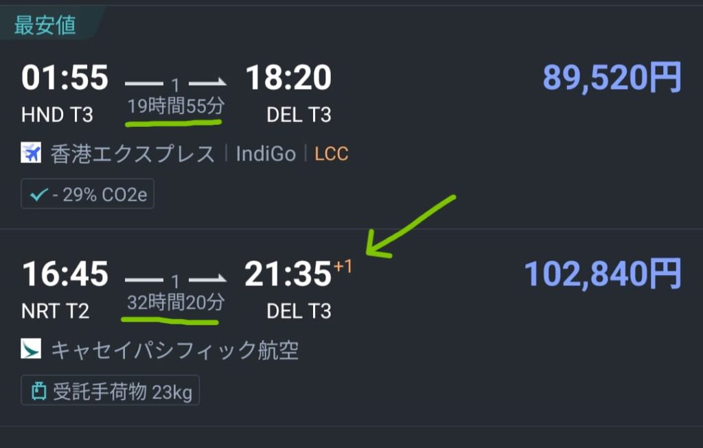 また、到着時刻の横にある「+1」は指定した日付より何日ずれているかを示している。つまりこの例だと、帰りを2月5日に設定していたが、実際には2月6日の21:35に到着する便だということを示している。この画像のように32時間なんてありえない。注意しよう。